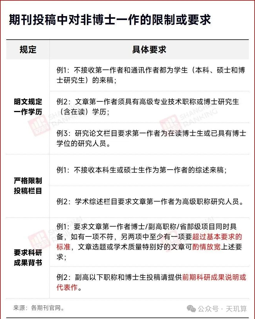 中国社科院刘宁研究员就提出,人文学科完全可以借鉴理工科的署名机制,这样既能防止“导师挂名一作”,又能保证学生稿件的可信度。总体来看,“不接收本硕生一作”并非孤立事件,而是学术出版系统中多重压力的叠加结果。期刊需要保持影响力,编辑要在有限资源下取舍,而学生和导师又处在评价体系的漩涡中。 学术的进步,从来不是靠“资深学者” 的独角戏,而是一代代研究者接力探索的结果。当期刊不再以学历设限,当署名回归贡献本质,当每一份有价值的研究都能被看见、被认可,年轻研究者才能真正沉下心来深耕学术,学术圈也才能始终保持蓬勃的创新活力。论文评价的核心应是质量而非作者学历,唯有打破“唯学历” 筛选,才能让更多有价值的研究成果脱颖而出。毕竟,学术的生命力在于思想的碰撞与突破,而非作者的学历高低。只有当期刊筛选、成果评价都真正以质量为核心标尺,才能让每一份扎实的研究都获得应有的认可,也才能为学术领域注入更持久的创新活力。本文内容来源于检索宝、软科,内容仅做学术分享之用,版权归原作者所有,不代表本公众号观点或证实其内容的真实性,如有侵权请联系删除,谢谢!