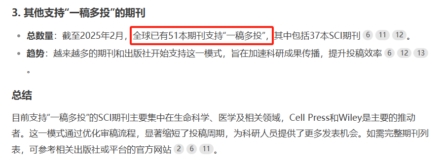 DeepSeek凭借其大量的信息储备,成为了科研人的贴心顾问。困扰科研人效率的“一稿多投”制度已经越来越被诟病,但我们发现如果最近你问它,“目前哪些SCI官方已支持一稿多投”。DeepSeek回答说有两个出版社,一共51本期刊已支持包括Cell  Press的Multi-Journal Submission 系统和Wiley的24hreview预审稿平台,后者支持作者一次同时选择3个期刊预审,还实现了5分钟提交、24小时反馈”的举措这两个知名国际出版社,都是打破“一稿多投”制度的先驱,值得点赞!也期待更多期刊,更多出版社紧随。DeepSeek的回复中,重点强调了24hreview,我们来看看。24hreview是由知名国际出版社Wiley参与发起的预审稿平台。入驻24hreview平台的期刊支持“一稿多投”,支持自由格式稿件,采用极简的流程,5分钟左右即可完成提交。同时,出版社组织专职编辑团队负责稿件处理,作者在24小时左右即可收到期刊编辑部“是否同意送审”的回复。作者只需在收到“同意送审”反馈后,再至官网正式提交,所以可以大幅节省投稿时间。继首批11本期刊成功入驻24hreview后,平台近日又有8本期刊上线,使得总数达到19本!新增期刊涵盖综合性研究、食品科学、护理学、医学实验技术、行为与神经科学以及水产科学等多个领域。01