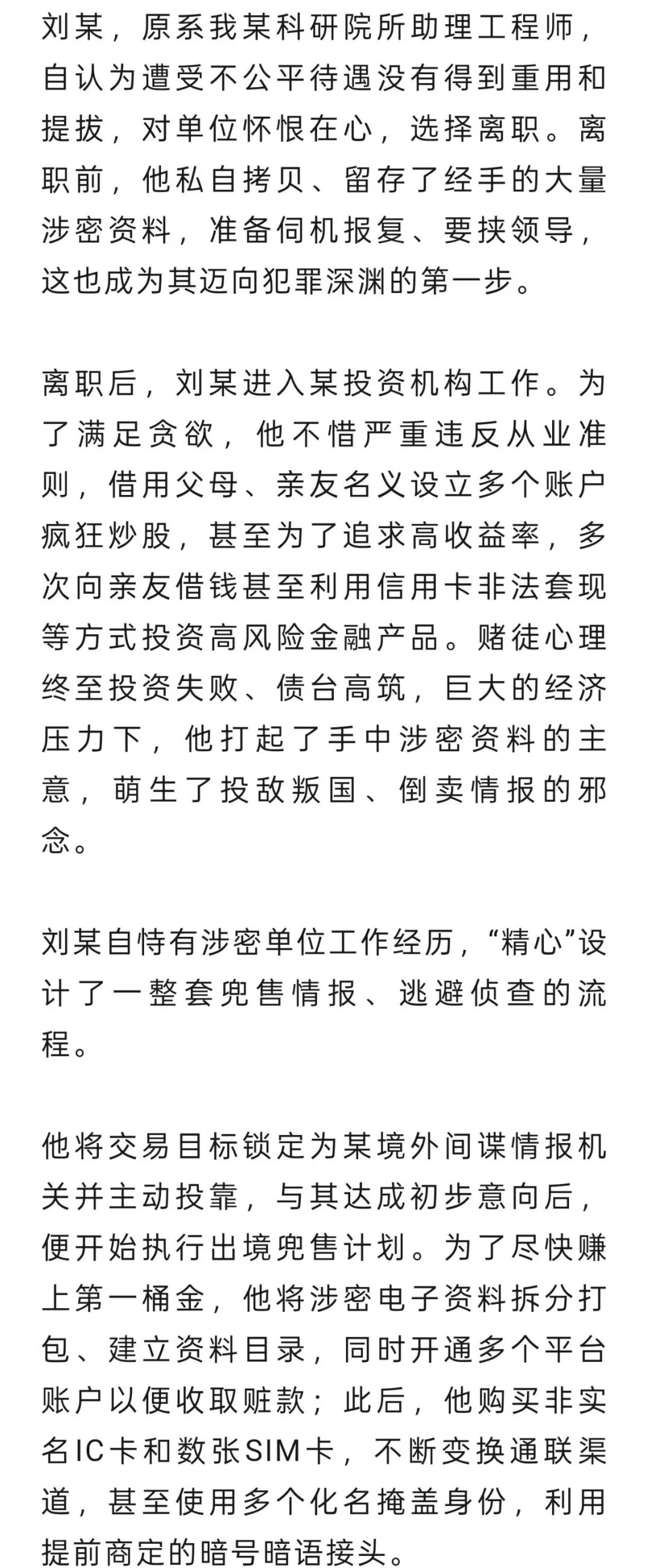 离职前拷贝涉密资料、设计推理“谍战剧本”,起底“精心”策划的间谍案今早(3月19日),国家安全机关破获一起我某科研单位工作人员私自拷贝、复制,并向境外间谍情报机关出卖大量国家秘密的间谍案件。 怨天尤人,误入歧途 急功近利,铤而走险