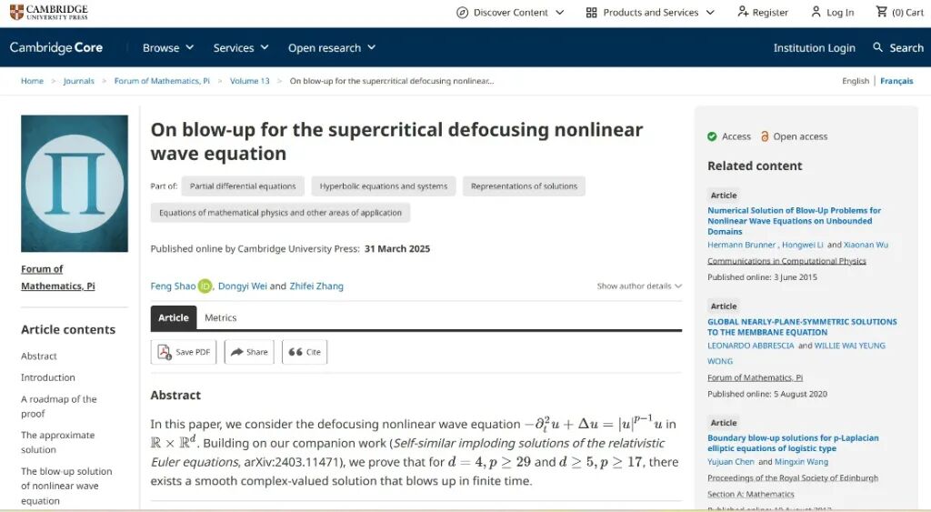 但在在舆论喧嚣之外,专注学术的韦东奕近日与其他两位学者章志飞、邵锋合作在数学界顶级期刊《Forum of Mathematics, Pi(数学论坛,π) 》以“On blow-up for the supercritical defocusing nonlinear wave equation(超临界散焦非线性波动方程的爆破现象研究)”为题发文。