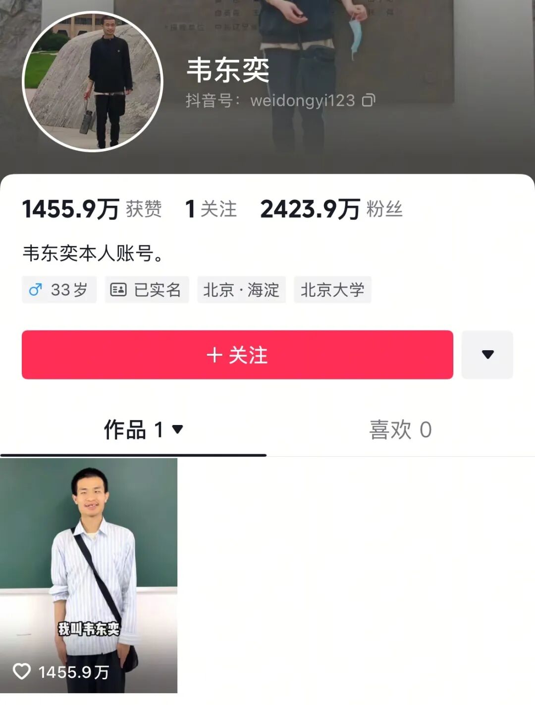 近日,在北京大学任教的韦东奕、网友熟悉的“韦神”发布视频和网友打招呼,其个人简介标注为“韦东奕本人账号”。截至6月10日12时,该账号已经有超过2400万粉丝。