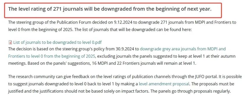 近日,芬兰出版论坛(JUFO)宣布了一项重磅决策:从2025年起,271种期刊,包括MDPI和Frontiers的众多刊物,将被降级至“0级”,即不满足基本学术标准。271种期刊中包括123本生物医学类期刊(全部名单见文末)。这一消息迅速在学术界引发了震荡,不少研究者和编辑对这一变化措手不及。