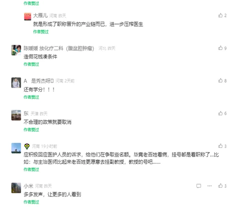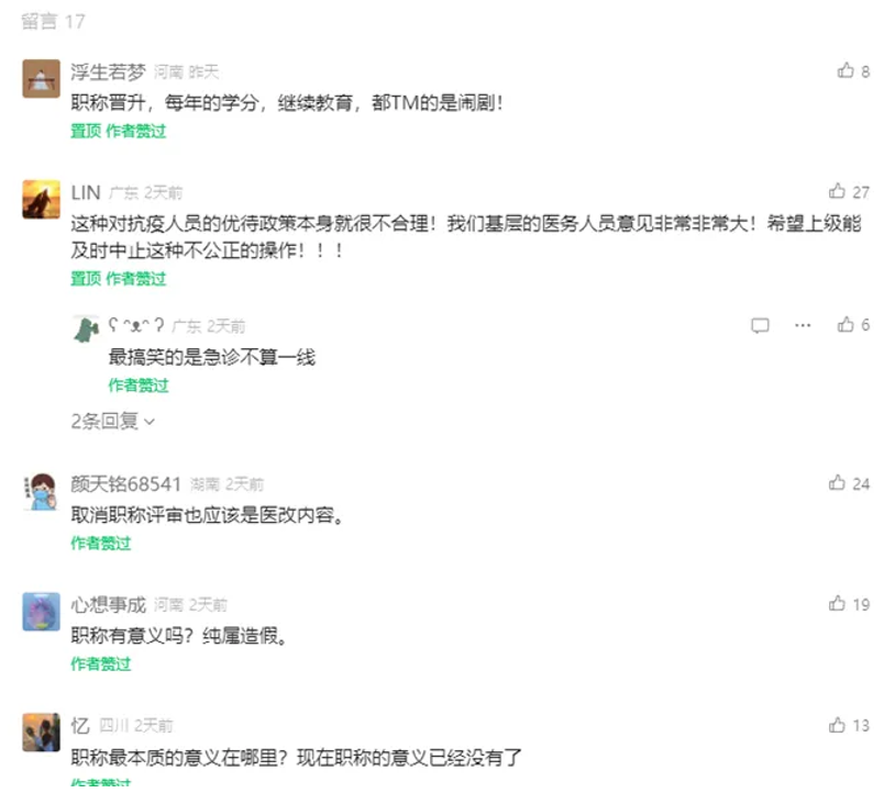 值得一提的是,在医护人员的诉求中,还有部分人员对当前的抗疫优待政策表示了不满,认为这些政策存在不合理之处,基层意见较大,希望医院能够停止不公正的操作。同时,也有人提出了更为激进的观点,认为应当直接取消职称评审制度,以更加灵活、开放的方式评价医护人员的专业能力。