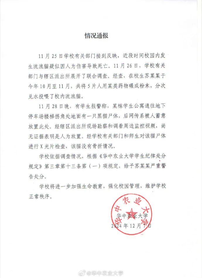 昨天(12月7日),@华中农业大学 发布情况通报: 11月25日学校有关部门接到反映,近段时间校园内发生流浪猫疑似因人为伤害导致死亡。 11月26日,学校有关部门与辖区派出所展开了联合调查。经查,在校生苏某某于今年10月至11月,共将5片人用某类药物碾成粉末,分次兑水投喂了校内流浪猫。 11月28日晚,有学生报警称,某栋学生公寓通往地下停车场楼梯拐角处地面有一只黑猫尸体,后网传系被人蓄意放置此处。经辖区派出所现场勘察和调看周边监控视频,尚无证据表明是人为放置。经学校有关部门和师生对该猫尸体进行X光片检查,该猫没有骨折情况。 学校依据调查情况,根据《华中农业大学学生纪律处分规定》第三章第十三条第(一)项规定,给予苏某某严重警告处分。学校将进一步加强生命教育,强化校园管理,维护学校正常秩序。 死猫出现在女生宿舍有学生怀疑多只流浪猫遭投毒 据网传的信息,华中农大校园,近日一只死猫出现在女生宿舍,在校学生包同学介绍,这只猫呈大字型疑似被粘在地上,动作奇怪,因而不少同学怀疑这只猫被人虐待致死后故意放置在这里的。当晚,学生进行了报警,也将相关情况反映给了学校。 包同学告诉记者,这不是第一只在学校离奇死亡的猫了,以前没有这么频繁出现过流浪猫死亡的情况,从今年10月开始,校园内陆续有10多只猫被发现有中毒嫌疑,她参与救助,记得其中救助的一只猫看起来四肢无力发抖、无法站立,有呕吐的情况,及时送医救治诊断是中毒了。此外,其他多只送医的流浪猫也基本诊断出了中毒的情况。 校园环境好,有爱猫氛围师生自发成立流浪猫救助组织