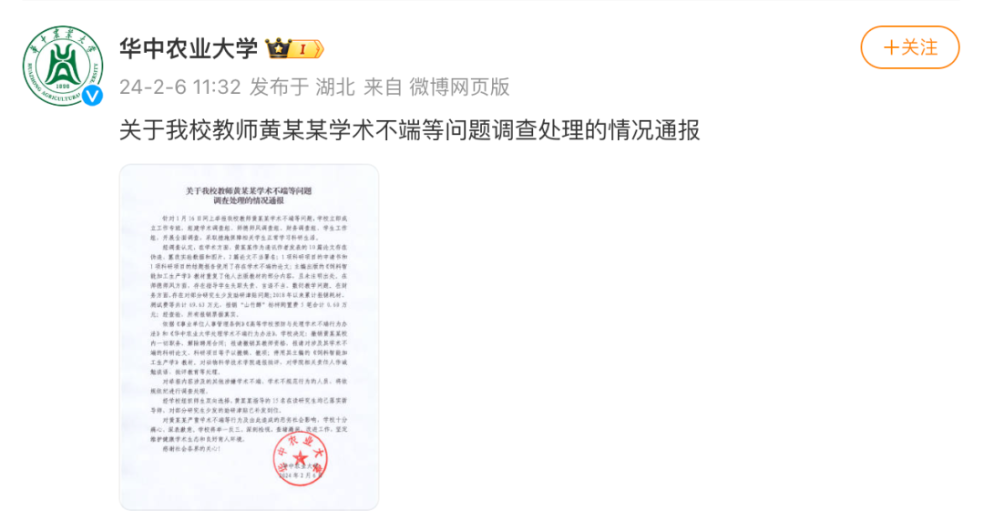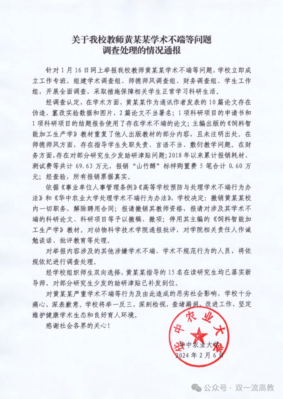 曾遭11名硕博学生联合举报的华中农业大学原教授黄飞若,近期遭多家国际级刊物撤稿。近日,多家生物学学术媒体发布消息,关注黄飞若团队多篇文章被撤稿消息。澎湃新闻记者查询发现,公开信息显示,截至12月10日,黄飞若团队被撤的期刊文章至少有4篇。例如,2022年12月14日,华中农业大学的Yao Weilei等人在International journal of cardiology 杂志在线发表题为《Embelin alleviates weaned piglets intestinal inflammation and barrier dysfunction via PCAF/NF-κB signaling pathway in intestinal epithelial cells》的研究论文,该研究表明,embelin 可改善断奶猪的肠道炎症,这可能是通过抑制 PCAF/NF-κB 信号通路介导的。但是,在2024年12月6日,该文章被撤回,主要原因是对数据的可靠性存在担忧。撤稿函显示,黄飞若是该文章的署名人之一。2020年3月2日,华中农业大学黄飞若团队在 Journal of animal science and biotechnology 杂志在线发表题为《Dietary garcinol supplementation improves diarrhea and intestinal barrier function associated with its modulation of gut microbiota in weaned piglets》的研究论文,该研究为未来开发藤黄酚功能性食品用于改善断奶仔猪腹泻和肠道屏障功能以及了解藤黄酚的生物效应及其作为功能性饲料添加剂的潜力提供了基础基础。2024年12月2日,该文章被撤回。黄飞若团队近期被撤回的文章还包括:2020年11月26日,华中农业大学黄飞若团队在Journal of Hepatology (IF=27)在线发表题为《Acetylation of lactate dehydrogenase B drives NAFLD progression by impairing lactate clearance》的研究论文。2017年12月28日,华中农业大学黄飞若团队在Animal Nutrition 在线发表题为《L-leucine stimulates glutamate dehydrogenase activity and glutamate synthesis by regulating mTORC1/SIRT4 pathway in pig liver》的研究论文。黄飞若原为华中农业大学动物科学技术学院教授,今年1月遭到学生联名举报。当时,华中农大11名硕、博研究生联合举报其存在篡改数据、编造实验结果等学术不端行为,引发广泛关注。据媒体报道,举报材料长达125页,列举了黄飞若指示学生在科研实验中进行数据篡改、重复使用、编造数据以及操纵同行评审、克扣学生劳务费、打压学生、论文不当署名、教材编写造假等行径。参见《11名硕、博研究生,实名举报导师造假!校方回应:启动调查华中农大2月发布情况通报称,经调查认定,在学术方面,黄某某(即黄飞若)作为通讯作者发表的10篇论文存在伪造、篡改实验数据和图片,2篇论文不当署名,1项科研项目的申请书和1项科研项目的结题报告使用了存在学术不端的论文;主编出版的《饲料智能加工生产学》教材重复了他人出版教材的部分内容,且未注明出处。在师德师风方面,存在指导学生失职失责、言语不当、敷衍教学问题。在财务方面,存在对部分研究生少发助研津贴问题。依据《事业单位人事管理条例》《高等学校预防与处理学术不端行为办法》和《华中农业大学处理学术不端行为办法》,学校决定:撤销黄某某校内一切职务,解除聘用合同;报请撤销其教师资格,报请对涉及其学术不端的科研论文、科研项目等予以撤稿、撤项;停用其主编的《饲料智能加工生产学》教材。对动物科学技术学院通报批评,对学院相关责任人作诫勉谈话、批评教育等处理。今年10月,国家自然科学基金委员会监督委员会通报了新一批科研不端行为案件处理结果。其中提到,国家自然科学基金委员会监督委员会对湖北某高校黄飞若、王同心等发表的论文涉嫌学术不端开展了调查,涉及10篇论文。经查,1篇论文中相同图片代表不同含义,存在图片使用混乱问题;1篇论文与本团队2019年发表的其他论文文字撰写高度重复,存在违反论文发表规范的问题;7篇论文中描述的数据与原始数据不符,存在数据篡改的问题;1篇论文存在伪造数据的问题。黄飞若(10篇论文通讯作者)、王同心(7篇论文第一作者,1篇论文共同第一作者)等应分别对相应论文存在的问题负责。此外,黄飞若将4篇涉事论文列入了基金项目(批准号31572409)进展/结题报告中,将4篇涉事论文列入基金项目(批准号32072742)申请书、进展/结题报告中,黄飞若还应对此负责;王同心将3篇涉事论文列入基金项目(批准号32302763)申请书中,王同心还应对此负责。经国家自然科学基金委员会监督委员会六届三次会议审议,由国家自然科学基金委员会2024年第5次委务会议审定,决定依据《国家自然科学基金项目科研不端行为调查处理办法》第四十七条、第四十条、第四十二条第五项、第四十六条,撤销黄飞若国家自然科学基金项目“组蛋白乙酰化调控Wnt∕β-catenin通路在猪肝脏氨代谢中的作用及机理研究”(批准号31572409)和“PCAF调控丙酮酸代谢在妊娠后期母猪肝脏糖代谢紊乱中的作用机制”(批准号32072742),追回2个项目的已拨资金,取消黄飞若国家自然科学基金项目申请和参与申请资格5年(2024年3月26日至2029年3月25日),给予黄飞若通报批评。通报最后称,决定依据《国家自然科学基金项目科研不端行为调查处理办法》第四十七条、第四十条、第四十二条第五项,撤销王同心国家自然科学基金项目“PDH乙酰化导致断奶仔猪肝细胞丙酮酸代谢障碍的分子机制”(批准号32302763),追回已拨资金,取消王同心国家自然科学基金项目申请和参与申请资格3年(2024年3月26日至2027年3月25日),给予王同心通报批评。点关注   不迷路