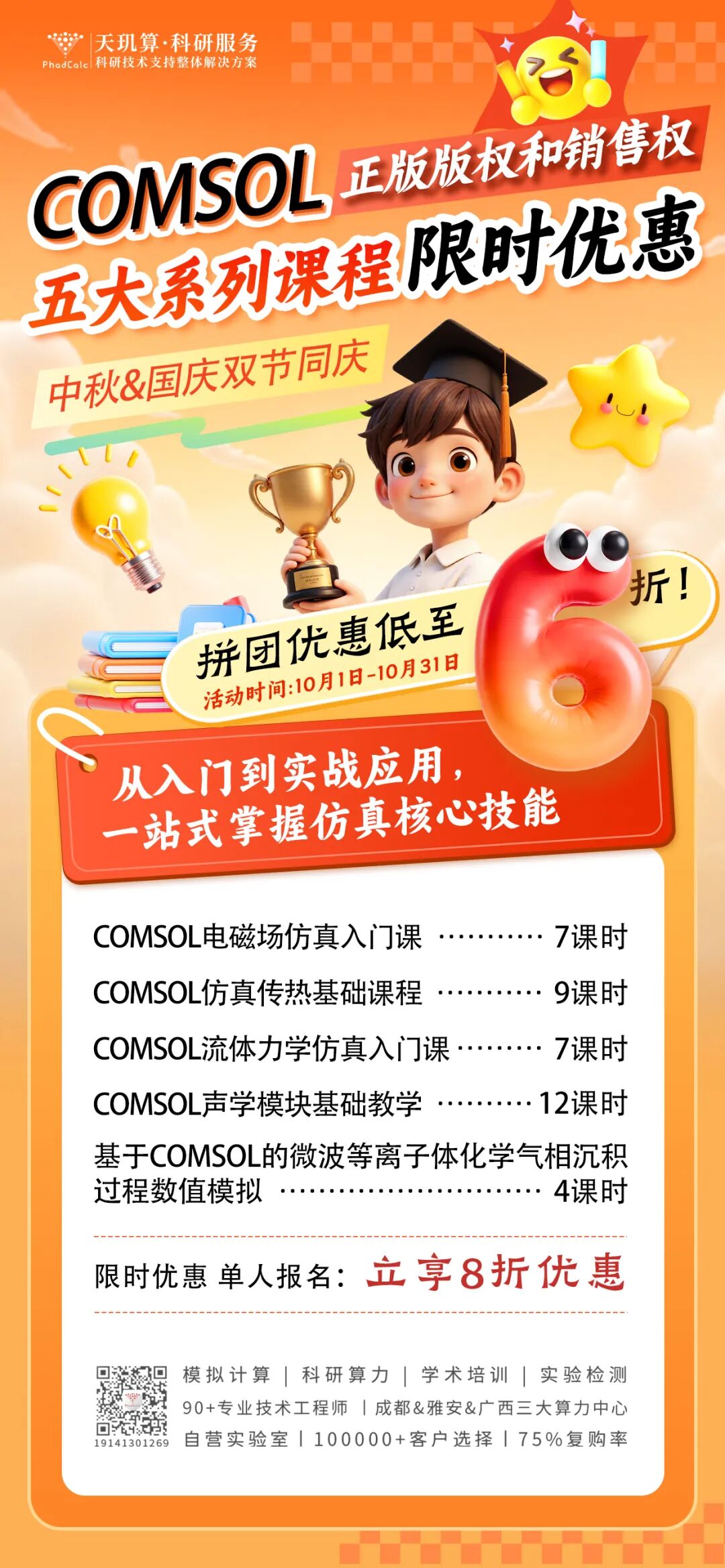 📅 优惠时限:即日起至10月31日   课程优势是什么? 官方合作,正版授权天玑算与COMSOL达成官方合作,拥有COMSOL官方版权及销售权,确保你学到的每一个操作都符合官方标准与最佳实践。 讲师实战经验丰富主讲专家具备多年COMSOL实战与项目经验,课程内容源于实际工程与科研项目,拒绝“纸上谈兵”。 体系化教学+案例驱动每门课程都从基础讲起,逐步深入,配合完整建模流程与真实案例,带你真正实现“从0到1”的突破。  如何抢占福利? 添加下方天玑算-专属咨询顾问微信,立即享受以下福利:①获取课程详细目录,并享受专属优惠; ②COMSOL正版软件采购与咨询服务; ③企业级技术支持和定制化培训解决方案。 微信:TJS10591 电话:15184488722 更多精彩课程,尽在天玑智研! 更多精彩课程,均在天玑智研。现在下载 “天玑智研” APP,不仅能随时随地开启学习,还有更多惊喜福利等着你!点击下载,让科研难题迎刃而解,开启你的科研进阶之路!大家扫描下方二维码即可下载 (也可在各大应用商城下载安装“天玑智研”)  APP内拥有5000+科研视频课时 更有其他精品课、定制课、直播课供您选择 畅学科研,尽在“天玑智研” 本文图片来源于软件官网,内容仅做学术分享之用,版权归原作者所有,不代表本公众号观点或证实其内容的真实性,如有侵权请联系删除,谢谢!