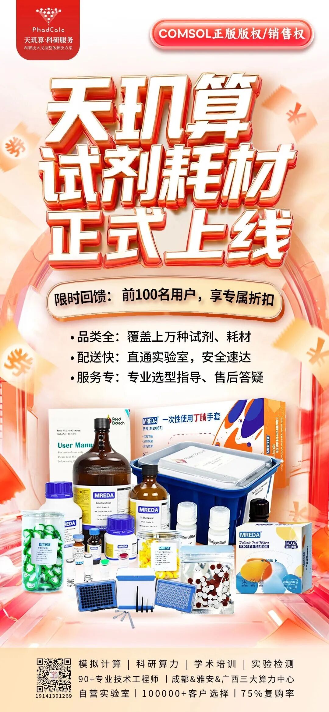 你是否曾为找不到合适的试剂焦虑?你是否因耗材短缺耽误实验进度?你是否在选型时毫无头绪、担心售后问题无人解答?现在,这些烦恼都将迎刃而解,因为——天玑算·试剂耗材 正式上线啦! 限时回馈 前 100 名用户,享专属折扣 作为天玑算试剂耗材的首批用户,我们特意准备了一波专属上线福利: 前100名用户,即可解锁专属折扣优惠,助力您的每一分科研投入,名额有限,先到先得! 品类全 覆盖广,找得快 平台覆盖上万种试剂、耗材,无论是分子生物学实验常用的 PCR 试剂、核酸提取试剂盒,还是细胞培养所需的培养基、血清,亦或是化学实验中的各类试剂、玻璃器皿、一次性耗材等,在这里都能一站式找到。配送快 直通实验室,安全速达 我们优化仓储与物流网络,打造高效的配送体系,确保试剂耗材从仓库发出后,能以最快速度直通你的实验室。同时,针对特殊试剂,我们采用专业的包装方式,保障试剂在运输过程中的质量安全,承诺快速直达您的实验室,最大限度缩短您的等待时间,确保实验计划顺利推进。服务专 专业护航,省心放心 我们拥有一支专业的服务团队,团队成员均具备丰富的科研背景和试剂耗材相关知识。在您采购前,若对试剂耗材选型有疑问,专业人员会根据你的实验需求,为您提供精准的选型指导,帮您挑选最适合的产品;采购后,若遇到产品质量、使用操作等方面的问题,随时联系售后,我们会第一时间为您答疑解惑,提供解决方案,让您采购无忧、使用放心。未来已来 高校科研触手可及 天玑算一直致力于为科研人员提供优质的科研服务,此次试剂耗材业务的上线,是我们拓展服务领域、助力科研创新的又一重要举措。未来,我们还将不断优化产品品类和服务质量,为科研人打造更完善的科研支持体系。  现在,天玑算试剂耗材已正式上线,前 100 名专属折扣福利正在等你! 扫描上方二维码,或后台直接私信我们,即可咨询采购详情,锁定优惠名额。 赶紧邀请身边有需要的科研伙伴一起,开启高效、省心的实验物资采购新体验吧! 关于天玑算 ABOUT US 天玑算·科研服务,专注于为高校、科研院所及研发型企业提供科研技术支持整体解决方案,核心技术服务包含但不限于模拟计算、科研算力、学术培训、实验检测等,现已服务全国2000余高校院所及企业,累计服务人数超过100000人,客户覆盖全国30多个省市,为科技创新提供全流程解决方案。  公司拥有一支90余人的高素质专业技术团队,其中包括50余名全职硕博计算工程师,另外还有1000+技术认证工程师助力,这支专业团队构建了完善的模拟计算体系,全面覆盖第一性原理计算、分子动力学模拟、量子化学计算、有限元仿真等20多个专业细分领域,能够为不同学科领域的科研需求提供精准的技术支持。 为提升科研服务的品质与效率,天玑算建立了符合国际标准的自营实验室,引进赛默飞、布鲁克等国际一流品牌的高端实验设备,为科研工作提供坚实的硬件保障和技术支撑。  “天玑智研”旗下“天玑算”平行公司"天玑智算"作为高性能计算领域专业子品牌,已在成都、雅安、广西三地建成战略级算力中心,构建了大规模HPC集群,总算力突破20PFLOPS,硬件投资规模近亿元人民币。天玑智算自主研发了国内首个"算力+学习"一体化综合应用平台,已实现CPU、GPU、裸金属服务器等异构计算资源的智能调度与统一管理,为科研计算提供灵活高效的算力解决方案。 公司倾力打造的科研知识共享平台"天玑智研·学术共享平台"(PC端+移动APP双端覆盖),已形成包含5000+精品视频课时的庞大知识库,涵盖前沿技术、科研方法、学术工具等多个维度,全网课程累计播放量突破1000万次。该平台与公司专业技术服务深度融合,构建了"硬核技术支持+系统知识赋能"的双轮驱动服务体系,形成了从基础研究到成果转化的完整闭环。