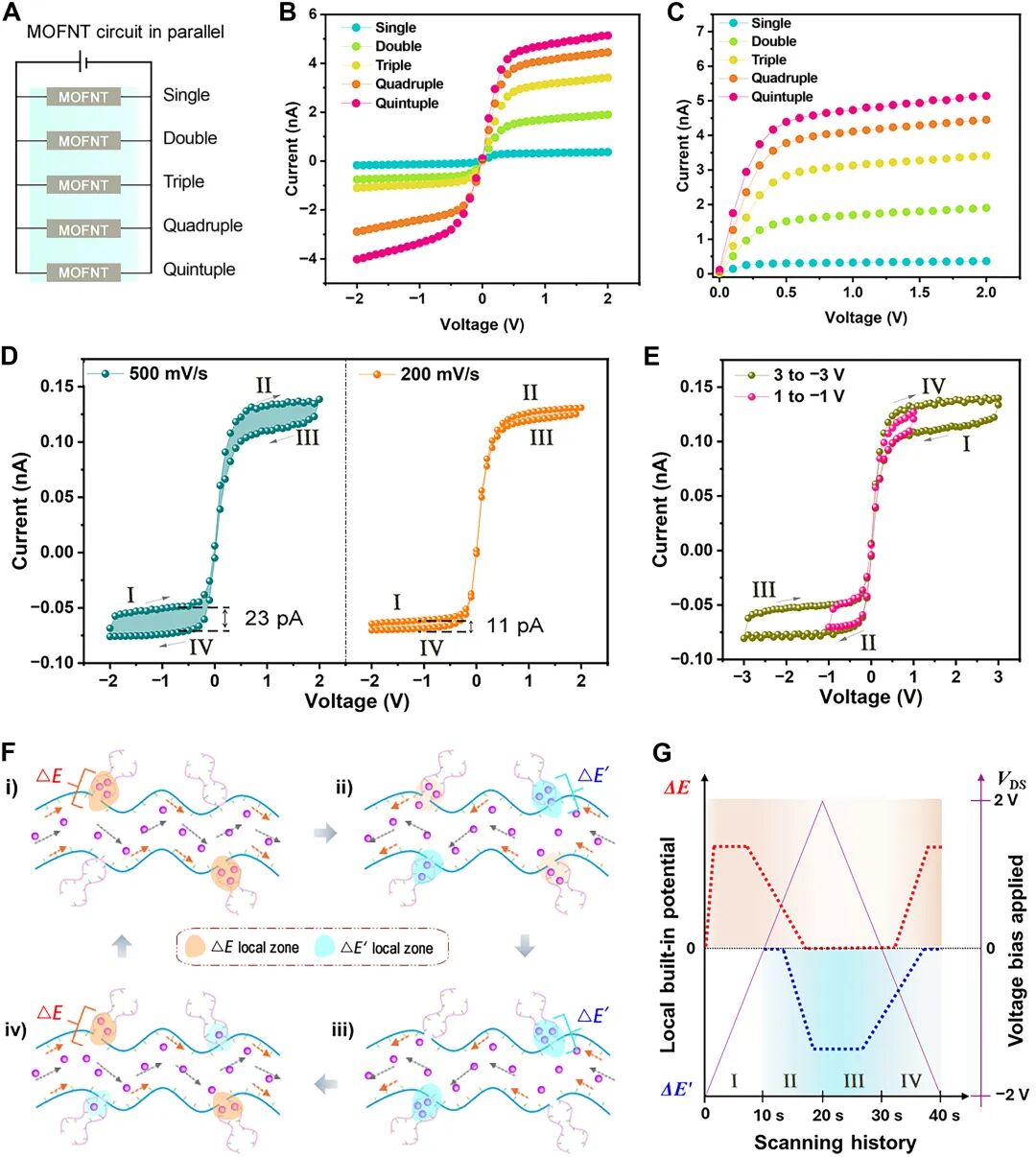 然后研究人员将h-MOFNT放置在不同电压偏置下的0.1 M 氯化物金属离子溶液中进行电流-电压 (I–V) 测试,观察离子(尤其是质子)在该器件中的传输特性。 其中,在HCl溶液中,低电压(0至0.2V)时电流快速增加,在中间范围(0.3至0.8V)时适度增加,在高电压(0.9至2V)时达到饱和电流水平,电流增长放缓。 不同于常见的二极管式(rectifying)整流行为,该器件整体呈现出类似三极管的非线性质子传输特性,换言之,说明此时质子的传输不是简单的线性随电压增加,而是在一定区间内被“阈控”或“门控”。 而在对其进行漂移扩散实验后,确认HCl和KCl的阳离子转移数分别为0.86和0.81,说明该特性主要来自于质子和K+离子的非线性电阻开关行为。 随后研究人员研究了浓度对其传输情况的影响,进一步证明了h-MOFNT对质子的普遍非线性传输特性。  利用这一性质,研究人员用五个h-MOFNT通过并行编程构建了一个小型流体电路,实验发现随着并联的h-MOFNT数量从单个到五个依次增加,产生了一系列非线性I-V曲线,模拟了通过增加门控电压实现电子FET的输出电流特性。 同时当h-MOFNT扫描环路电压时,表现出明显的滞后环路效应,并挤压滞后环路,扫描速率下降,表明非线性质子传输对电压扫描频率存在依赖性。 在对两个扫描电压示波器进行相反的扫描顺序时,例如从-2V到2V,再扫描回-2V,h-MOFNT表现出相同的流体忆阻和学习特性,即在一定条件下,器件能够记住过去电压状态。  原因是因为在MOF分层相中,内部电势对质子在施加电压后会进行反向传输,当电压处于-2V到0V时,由于质子跨相传导,将迅速产生局部电势ΔE,在级性转换后,ΔE也会短时间保持高水平再逐渐衰减。 残余ΔE将在0V到+2V时,继续施加相同方向的质子传输,并逐渐产生反向局部电位ΔE′,在+2V到0V时,ΔE已经完全消失,此时质子传输受到ΔE′影响,电流始终处于较低状态,在0V到-2V时,受剩下的ΔE′和负电压叠加影响,再次建立起类似于0V到+2V的ΔE。 这种建立下来的ΔE和ΔE′间隔约10秒,并可以通过高压扫描频率增强这种流体离子记忆,证明了该纳米流体晶体管具备短期记忆特性和仿生可塑性学习方式。 因此基于单晶胞或多晶胞厚度MOF的编程流体芯片是可行的,其在液态系统中体现出的开关、记忆等功能,都呈现出类电子器件的替代效果。 在未来或许只要通过合理设计异构约束系统,就能够实现基于液体的信息存储甚至类脑计算。 “无用”的MOF而在此之前,MOF一直被普遍认为是“无用”的。  即使是诺奖颁布当天,组委会在解释颁发理由时,用词也相当委婉: MOF潜力巨大,可以为一些新功能的定制材料提供前所未有的机会。