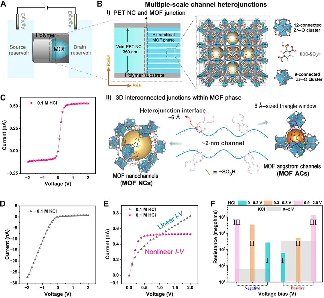 谁说获得诺贝尔化学奖的MOF(金属有机框架)“无用”? 这种几十年前被嫌弃“只有理论但缺乏实际应用”的新材料,前脚刚获得诺奖认可,后脚就被做成芯片。 这就是莫纳什大学的科学家们刚刚发布的最新成果 - 用MOF制造超迷你的流体芯片。 不同于传统芯片,不仅可以完成常规计算,还能记住之前的电压变化,形成类似大脑神经元的短期记忆。  正如作者所说,也许这将是新一代计算机的范例: 如果我们能够设计出像MOF这样只有几纳米厚的功能性材料,我们就可以制造出先进的流体芯片,以补充甚至克服当今电子芯片的一些局限性。 具有“类脑”记忆通路的纳米流体芯片纳米约束条件下的离子选择性传输正在生物机制仿真、离子分离、离子电子器件等方面展现出潜力,但由于难以制备高精度纳米通道器件,要想实现可调非线性的离子运输其实相当困难。 而用MOF材料制作出的纳米流体芯片则解决了这一点。 MOF本身具备明确的通道结构,而且适配多种化学成分,可以在分子和离子传输过程中完成原子级精度调节。 研究人员基于此,构建了一种分层纳米流体晶体管器件h-MOFNT。 该器件首先通过在聚合物单纳米通道(NC)中组装分层Zr-MOF-SO₃H晶体,制备了具有多个异质结的分层MOF基纳米流控器件。 具体来说,就是将具有一个子弹形状的纳米通道,即氨基修饰PET NC薄膜,夹在两个细胞之间,面向尖端的细胞填充配体水溶液,而另一个细胞则放置金属前体水溶液。 当金属前体和配体分子在PET NC内相遇,就会形成核,并在尖端侧进一步聚合成MOF晶体。  于是h-MOFNT将包含有两种类型的非均质通道结: - 一维 (1D) 异质结:直径为100纳米,位于聚对苯二甲酸乙二醇酯 (PET) 纳米孔 (PET NC) 和MOF密集相之间。