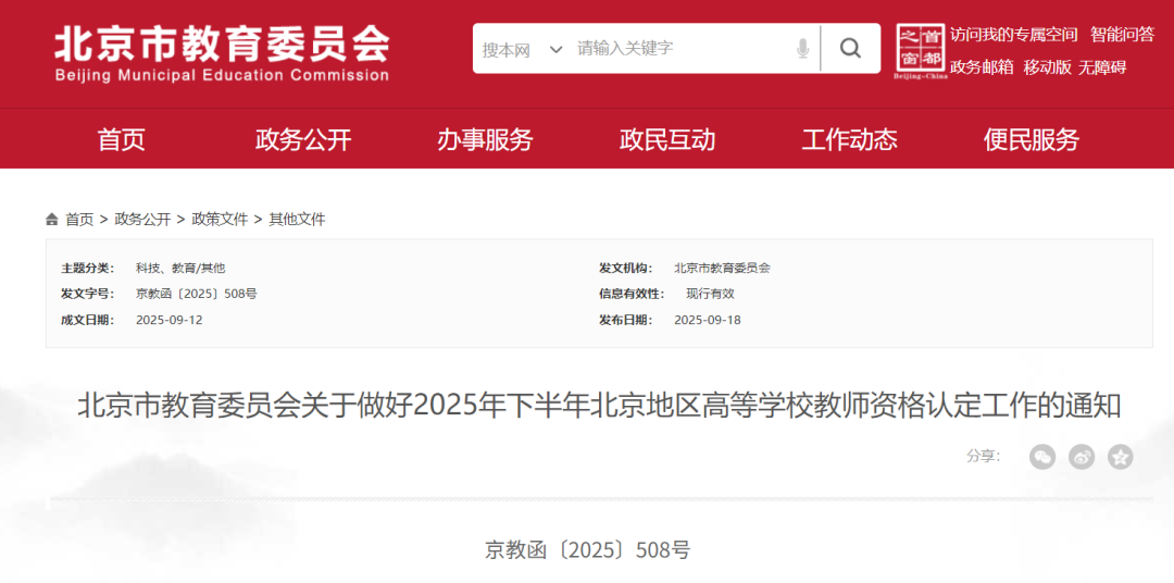 北京市教育委员会日前发布了《关于做好2025年下半年北京地区高等学校教师资格认定工作的通知》,其中明确: