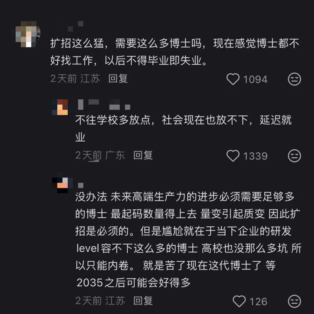 近日,上海交通大学发布了2026年博士研究生的招生简章,引起大家的广泛讨论。从招生简章上看,上海交通大学2026年博士生拟扩招到5000人。其中校本部拟招生4000人。而就在去年,上海交通大学2025年博士招生人数,为4000人,也就是说,今年上海交大的博士扩招了整整1000人!这是一个什么样的数字呢?对比国内高校来看,清华大学 2025 年博士招生约 4500 人,预计 2026 年接近 5000 人;浙江大学 2024 年博士招生 4800 余人,2026 年可能突破 5000 人;复旦大学 2026 年计划招生约 3600 人。若仅计算校本部 4000 人的招生量,上海交大已超过复旦大学全校规模,跻身国内高校第一梯队行列。对比国外高校来看,美国全国,每年招收约5.5万名博士生,哈佛大学 2024-2025 年度新招收博士生 1366 人,斯坦福大学每年约招 1000 人,加州大学伯克利分校材料科学系每年仅招 40 人。若按招生规模排序,上海交大已跻身全球前 5% 的博士生培养机构。也就是说,美国前二十高校年博士招生总和不足 5000 人,而上海交大一家的招生量已达到这一数字。(双一流高校2023-2024全日制研究生数量)其实上海交大的扩招并非孤例。中共中央办公厅、国务院办公厅印发的《关于加快推动博士研究生教育高质量发展的意见》明确提出,要 “服务国家战略、按需招生”,推动规模扩大与内涵建设相协调。从数据来看,我国博士生培养规模已稳步增长,2023 年应届博士毕业生达 7.52 万人,美国乔治敦大学研究更是指出,当前中国理工科博士培养数量已达到美国的 1.5 倍。面对如此大幅度的扩招,不少人会疑惑:“博士现在真的已经烂大街了吗?”、“扩招会不会稀释培养质量?”、“会不会出现‘水博’?”其实这些担忧并非个例,打开社交平台,上海交大博士扩招 1000 人这个话题,早就引起了大家的广泛讨论对此,你怎么看?欢迎在评论区留言!