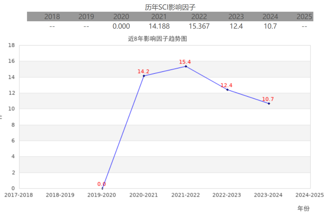 Small Methods在创刊后影响因子上涨的比较快,在12-15区间浮动,比较稳定。2022年影响因子12.4分,24年为10.7。02.