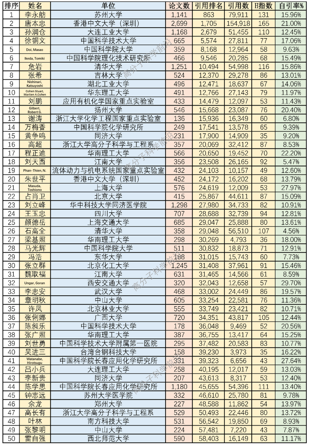 近日,斯坦福大学与国际权威学术出版社爱思唯尔共同发布了2025年度“全球前2%顶尖科学家榜单”。该榜单从全球近700万名科学家中遴选出世界排名前2%的顶尖学者,涵盖22个主学科领域和174个子领域。这种多维度的评价体系,旨在更全面、客观地衡量科学家的学术影响力,重点关注科学家有意义的研究影响,而不仅仅是论文产出数量。在本次榜单中,高分子科学领域表现亮眼,中国单位多位科学家凭借其卓越的学术影响力入选。其中,部分学者同时在反映近期活跃度的“年度科学影响力榜单”和代表长期学术积淀的“终身科学影响力榜单”中排名靠前,展现了他们在高分子领域的持续引领作用。以下是以国内单位、高分子领域为筛选条件,并且同时入选筛选后“年度”和“终身”两份榜单前20名的中国学者简介:唐本忠教授 [img][/img]唐本忠教授于1982年和1988年先后获华南理工大学学士学位和日本京都大学博士学位。曾在日本NEOS公司中央研究所任高级研究员、加拿大多伦多大学从事博士后研究。1994–2021年在香港科技大学工作。2009年和2020年先后当选中国科学院院士和发展中国家科学院院士。2021年加入香港中文大学(深圳)担任理工学院院长、校长学勤讲座教授。在学术会议上作了500多场邀请报告,拥有100多项授权专利。现任德国Wiley出版社发行的Aggregate《聚集体》杂志主编以及20多家科学期刊顾问、编委或客座编辑。主要从事材料科学,高分子化学和生物医学诊疗等研究。在聚集诱导发光(Aggregation-Induced Emission, AIE)这一化学和材料前沿领域取得了原创性成果,是AIE概念的提出者和AIE研究的引领者。2014年至今连续当选材料和化学双领域“高被引科学家”。2007年获Croucher基金会高级研究员奖,2014年获Khwarizmi国际奖,2015年获广州市荣誉市民称号,2017年获国家自然科学一等奖、何梁何利基金科学与技术进步奖,2021年获Nano Today国际科学奖,2023年获Biomaterials全球影响力奖,2024年获中国化学会–中国石油化工股份有限公司化学贡献奖。孙润仓教授 [img][/img]孙润仓教授于1982年毕业于西北大学化学系,1996年获英国威尔士大学博士学位,曾兼任华南理工大学制浆造纸工程国家重点实验室主任(2008.08-2015.05)及北京林业大学材料科学与技术学院院长(2011.10-2015.09),现为大连工业大学轻工与化学工程学院教授、博士生导师。四十年来,一直从事木质纤维生物质三大组分清洁高效分离及转化为新材料、新能源及化学品方面的研究。发表JCR一区SCI收录论文565篇,发表EI收录论文60余篇,论文被正面引用5.5万余次,国际会议特邀、大会及主题报告60余次。主编Cereal Straw as a Resource for Sustainable Biomaterials and Biofuels: Chemistry, Extractives, Lignins, Hemicelluloses and Cellulose专著1部 (2010, Elsevier),同时还被国外专家邀请参与编写Hemicelluloses: Chemistry and Technology等英文专著36部和英国科学分离百科全书1部,授权发明专利154件。入选“国家高层次人才”特聘教授项目,国家杰出青年基金获得者,“长江学者奖励计划”特聘教授,973首席科学家;系列研究成果分别获国家技术发明二等奖,教育部自然科学一等奖、技术发明一等奖及科技进步一等奖,陕西省科技进步一等奖,中国轻工业联合会技术发明一等奖,中国产学研合作创新奖,第十一届光华工程科技奖获得者,2020年获美国化学会安塞姆·佩恩奖。李永舫教授 [img][/img]李永舫教授于1982年在华东化工学院(现名华东理工大学)化学系获硕士学位,1986年在复旦大学化学系物理化学专业获博士学位(导师吴浩青先生)。1986-1988年在中国科学院化学研究所跟随钱人元先生进行博士后研究,1988年留化学所工作,1993年晋升研究员。曾于1988-1991到日本分子科学研究所和1997– 1998到美国加州大学圣巴巴拉分校(UCSB)进行访问研究。主要从事聚合物太阳能电池光伏材料和器件以及导电聚合物电化学等方面的研究,提出通过共轭支链来拓展聚合物共轭程度、从而拓宽其吸收光谱的分子设计思想;通过使用富电子的茚双加成提高了C60的LUMO能级,使用茚双加成富勒烯衍生物(ICBA)新型受体光伏材料创造了基于P3HT光伏器件效率的新纪录。此外,在吡咯电化学聚合反应机理和聚合反应动力学、导电聚吡咯的两种氧化掺杂结构和电化学氧化还原反应机理,无机半导体纳米晶的溶液法制备及其在有机/无机杂化光电子器件方面的应用等方面也取得了一系列具有重要影响的研究成果。已发表研究论文400 多篇,国内外学术会议大会报告和邀请报告70多次。1998年获人事部授予中青年有突出贡献专家称号,1995年获国家自然科学奖二等奖(第二完成人)、2005年获北京市科学技术奖一等奖(第一完成人),2013年获北京市科学技术奖二等奖(第一完成人)。徐铜文教授 [img][/img]徐铜文教授于1989、1992获合肥工业大学学士和硕士学位,1995年获天津大学博士学位,1997年南开大学博士后出站加入中国科技大学工作至今,期间先后在东京大学、东京工业大学、韩国光州科技研究所访问研究。目前为中国科学技术大学二级教授,享受国务院政府特殊津贴;先后入选教育部“长江学者”特聘教授,国家杰出青年科学基金获得者,国家重点研发计划首席科学家,国家百千万人才工程;目前担任中国膜工业协会电驱动膜专委会主任,Journal of Membrane Science、Industrial Engineering & Chemical Research等10余种国际英文期刊的编辑/编委及《化工学