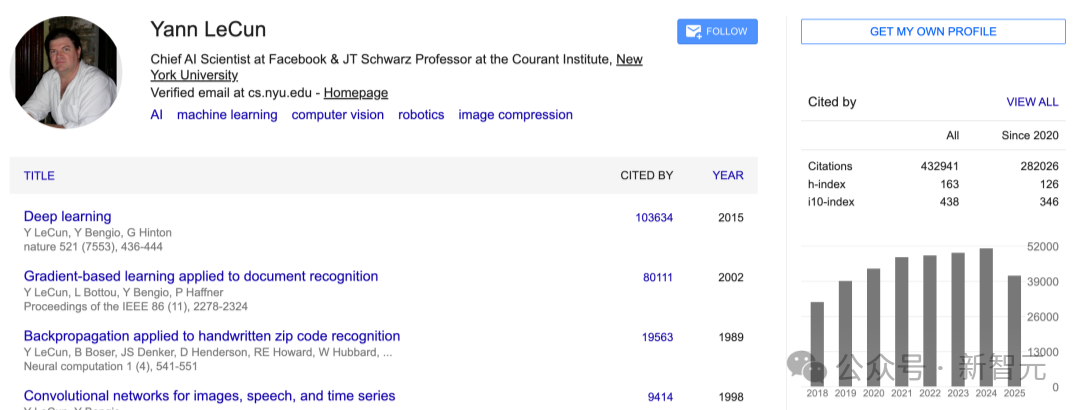 同为图灵奖三巨头的Yann LeCun也有43万+的引用。